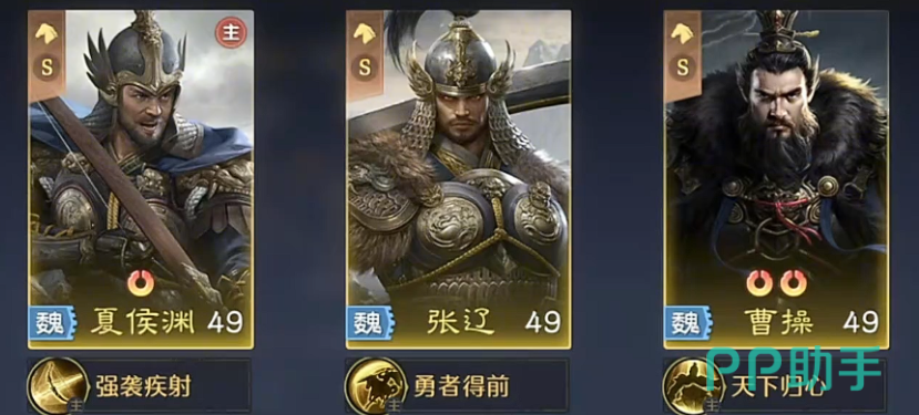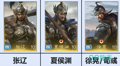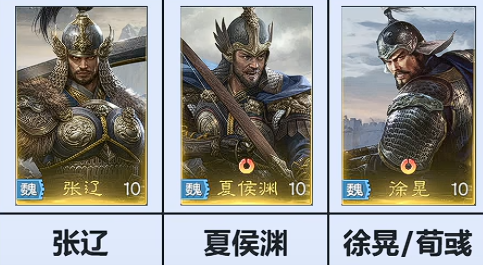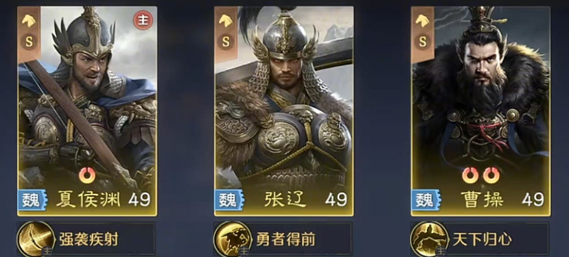 第三套为「双骑夹击突袭流」:由张辽、夏侯渊与曹操构成。相较第一套,仅将徐晃替换为同属骑兵阵营的夏侯渊,从而激活双骑兵专属协同效果,大幅提升机动性与侧翼突袭能力。夏侯渊与张辽均具备高移速与快速打击特性,可分路切入敌方侧阵与后排,形成交叉火力压制;曹操继续承担保护职责,提供减伤与恢复支持,确保双骑在高风险突进过程中维持生存能力。虽然该阵容连击覆盖率略低于铁壁流,但群体总伤更高,对敌方保守布阵(如厚前排+集中后排)具备更强针对性,竞技场胜率更为可观。