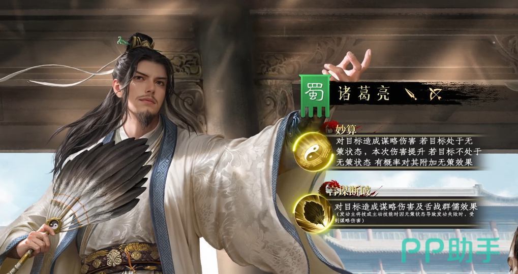 诸葛亮是策略系压制体系的核心代表,拥有免控特性保障操作稳定性。其技能可对敌方施加谋略伤害,若目标处于“无策”状态,则伤害提升50%。在约50%概率成功施加“无策”的基础上,还将同步触发“舌战群儒”效果,使目标在6秒内使用主将技时,额外承受一次谋略伤害。这一机制充分体现其“以攻为守、先手破局”的战术思想。