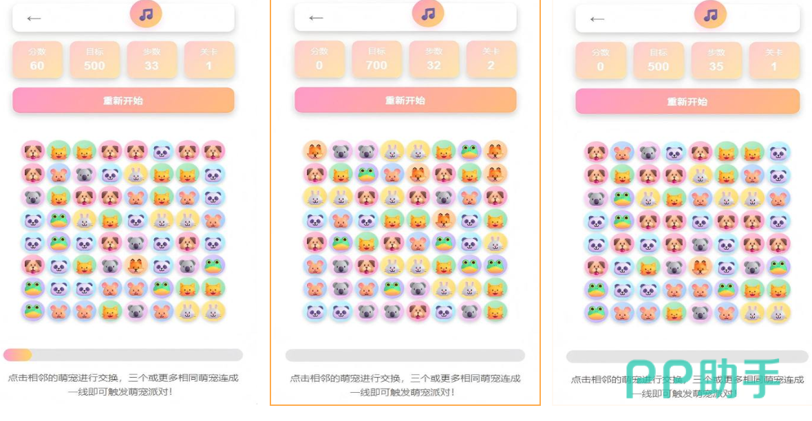 《萌宠消消看》在传统三消玩法的基础上增加了宠物收集、养成的元素。玩家在消除相同的元素时,会得到不同的宠物奖励,每只宠物都有不同的技能,在关卡中可以起到辅助的作用。随着关卡的推进,障碍物、限制条件越来越多,玩家在完成任务的同时还要灵活地使用宠物技能。另外游戏有花园、房间、森林等场景主题,各个场景的关卡顺序以及动画效果都不相同,从而提升了视觉趣味性。玩家在挑战中可以获得道具和货币,用来解锁更多的宠物或者升级技能。