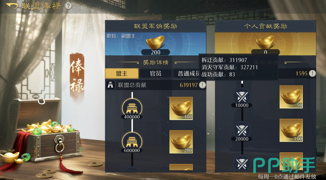 同盟物资补给按自然周循环发放,所有成员均可领取基础资源包。此外,每位玩家的同盟贡献值将作为福利分配依据:日常任务完成、资源捐献行为、协同出征次数等均计入贡献统计。高贡献成员可优先兑换稀有道具、限定外观及特殊增益效果,实现个人成长与集体利益的双重绑定。