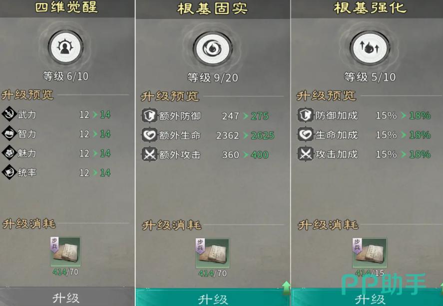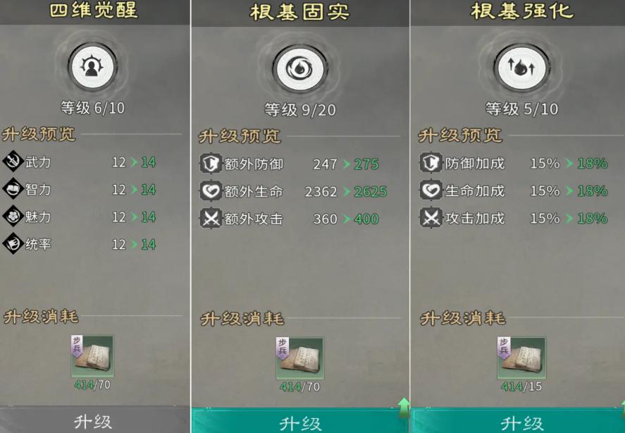 待技能等级达到中期节点(如Lv.15以上)后,再转向能力强化模块。其中,四维觉醒为最高优先级:每级提升力量、统率、智力、速度四项基础属性,对输出、承伤、控制链、行动节奏形成全局性加成。四维完成后,依次推进“根基固实”(固定数值血量/防御/攻击提升,前中期性价比突出)与“根基强化”(百分比属性加成,中后期释放更大潜力)。