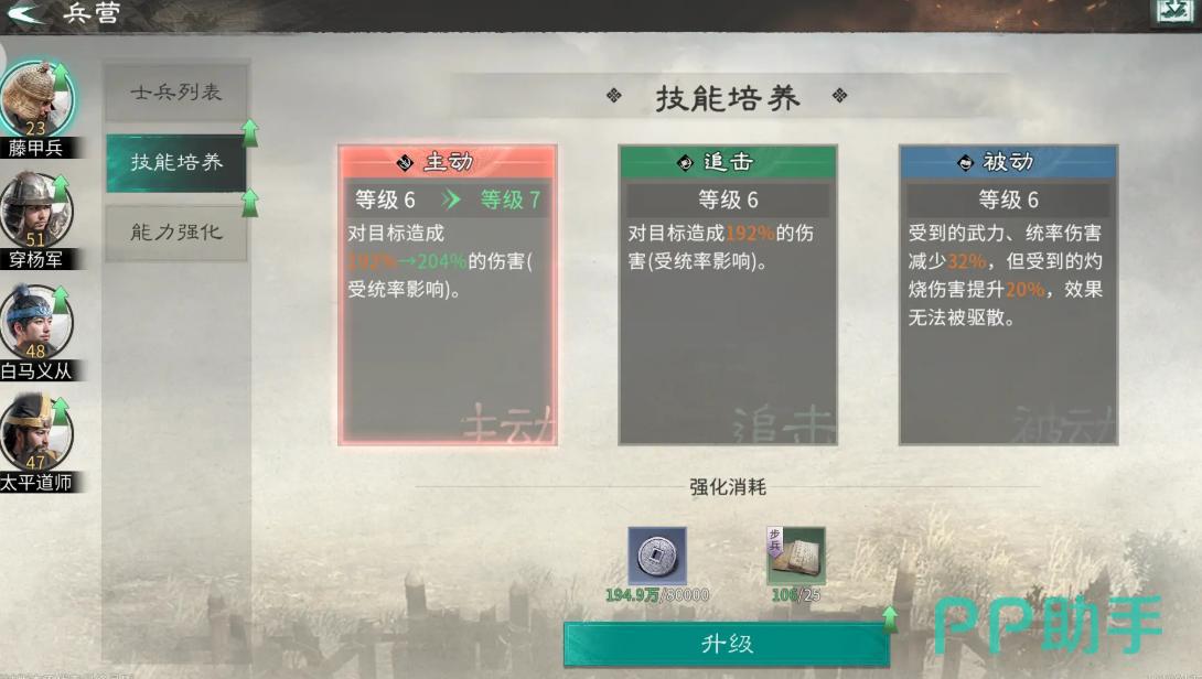 当士兵四维与根基体系基本成型,即可根据兵种定位选择差异化加成路线。藤甲兵主走防御纵深路线,推荐专精“御守之坚”,每级提升2%伤害减免,进一步夯实其前排抗压能力;穿杨军侧重群体压制,首选“破军之力”,每级增加2%伤害加成,强化AOE清场效率;白马义从与太平道师则适用均衡路线“双修”加成,每级同步提升1%伤害加成与1%伤害减免,兼顾输出稳定性与生存容错率。