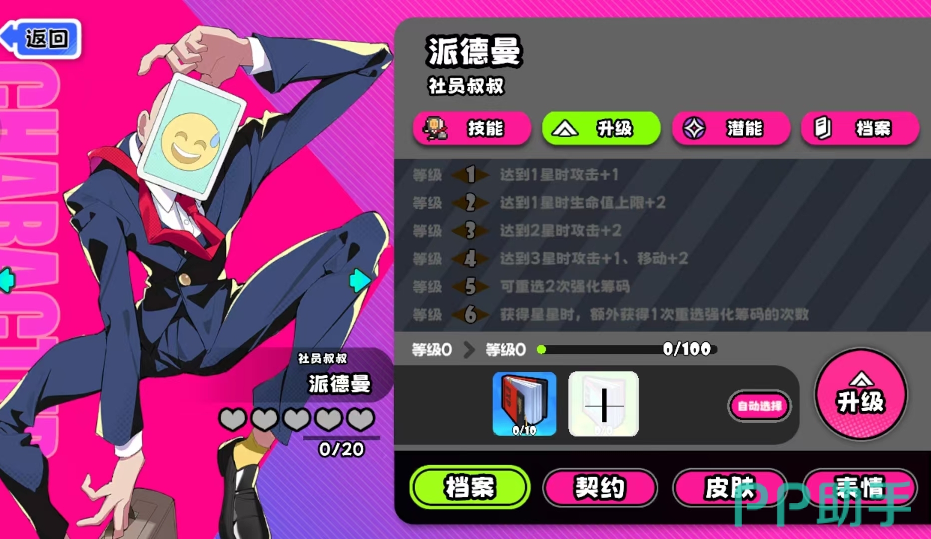 派德曼也是一位能开启潜能的角色,并且他的潜能所带来的提升非常大,也有不错的娱乐性。只要派德曼在对战时摇出来了6点,那么不管对手的防御力叠加到了多少,派德曼的此次攻击都能无视防御力的效果并造成全额伤害。而且这一潜能还有保底机制,若派德曼在对战时摇出的点数小于2,那么他下次对战摇出的点数必定会为6,令他能获得一次无视对手防御力的效果。此外,派德曼的等级可先升至二级,有条件可升四级,若不拿他来进行合作模式的作战,五、六级甚至可不升。