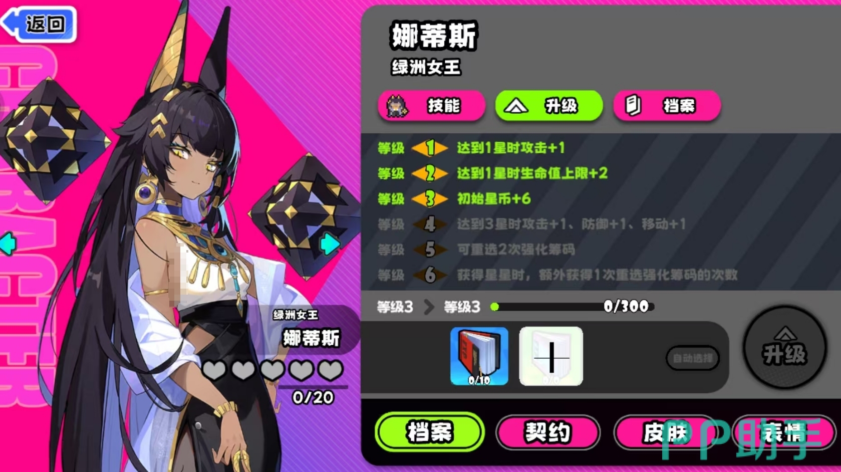 角色养成方面,娜蒂斯的成长曲线表现优异。等级一即可解锁“获得一星时+1攻击力”的基础增益;升至二级后新增“一星状态下生命上限+2”,有效增强生存容错能力,降低非战斗场景中因血量过低被意外击晕的风险;三级时初始星币+6,大幅提升前期经济启动效率;而四至六级的进阶强化,则进一步巩固其在中后期的持续作战能力,尤其在合作模式中,有助于更稳定地达成筹码获取目标。