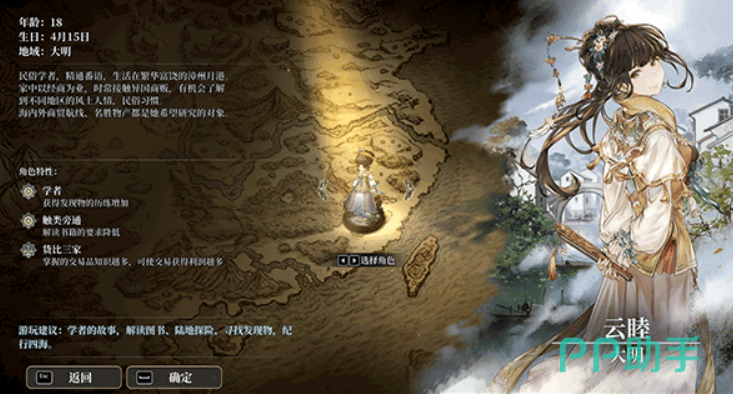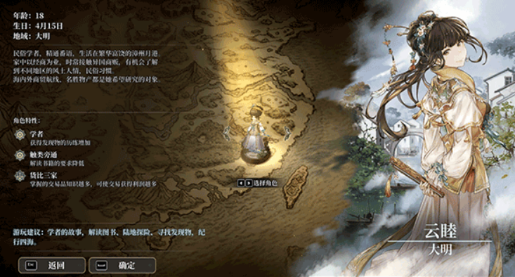 最后一个是云睦,她是个学者型的角色,出生在漳州的商人家庭。这个姑娘外表看着温柔,但性格其实挺坚强的,很有自己的主意。因为从小家庭条件不错,所以读了不少书,还会好几国的语言,特别喜欢研究各个地方的风土人情和地理环境。家里做生意的关系让她能接触到很多外国商人和旅行者,听他们讲各种故事,对大洋另一边的世界充满了好奇心。最后为了写一本自己的书,她决定出海去亲眼看看不同国家的情况。云睦这个角色找到发现物的时候经验会增加,解读书籍的要求会降低,而且掌握的交易品知识越多,做生意赚的钱就越多。