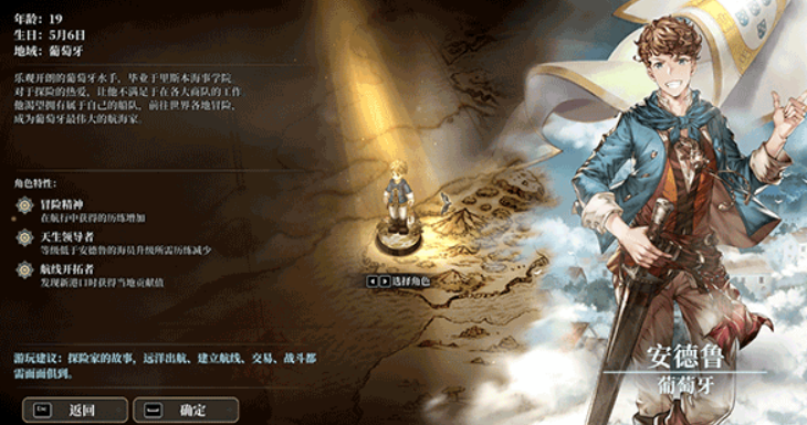 第二个角色是安德鲁,这人来自葡萄牙,是个特别乐观的水手。虽然家里条件很普通,但他就是喜欢航海这件事,靠着自己努力考进了海事学院。安德鲁从小就想着能开船去看看那些没人去过的地方,但问题是当时的船队基本都被贵族把持着,他就算学了一肚子知识,也只能干最基础的活。平时就是修修船,打扫打扫卫生,偶尔能去船长室或者测绘室清理的时候,会偷偷多学点东西。后来航海热潮兴起了,安德鲁觉得在商队打工已经满足不了他的想法了,就决定自己组建探险队,要去世界各地闯一闯。他这个角色比较适合喜欢探索的玩家,航行的时候经验值会涨,发现新港口还能直接获得当地的贡献度。