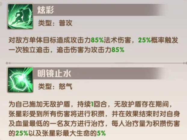 前排推荐大家选择张星彩,这就是萌新的保命神器。明镜止水怒气技能就可以给自己上一回合的无敌护盾,在这个过程中所承受的伤害全部都会积攒下来,在结束之后可以奶血量,还可以帮助队友。治疗量是积攒伤害25%,然后加上自身最大生命值的5%。不管是抵抗伤害,还是抬血线都是比较靠谱的,有他在阵容中,那么容错率也会飙升。诸葛亮和黄月英的羁绊也必须要激活,两人同时上阵,就可以获得12%的攻击。黄月英的普攻对于肉盾职业的伤害也可以提升50%。