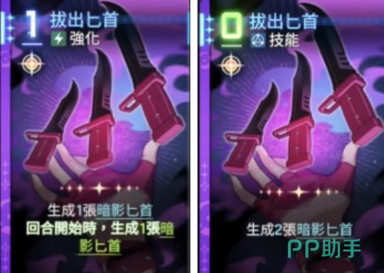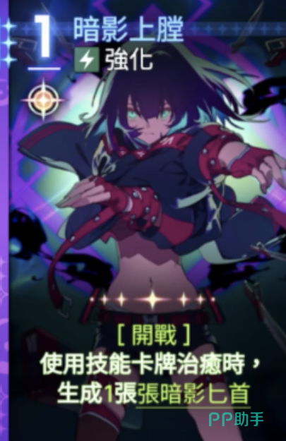 比如说拔出匕首,这个卡牌也是德蕾莎特定的一张卡牌,在此期间只要生成两张零费的攻击卡,也就是说匕首,那么在这里带来的每一张卡牌都可以造成50%的伤害,这里的伤害一般都是会带有两层痛苦状态进行叠加,状态给到敌人之后痛苦的能力基本都是给德蕾莎带来主要伤害的来源,那么这里能力根据德蕾莎的回合结束之后,带来的固定伤害进行查看的话,一般情况下是根据德蕾莎目前能够造成了多少层痛苦进行叠加累积,而在暗影上膛这个卡牌当中,其实不仅可以给德蕾莎带来一定百分比治疗,还会生成一张高级的暗影匕首。
