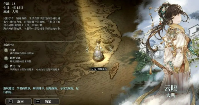 游戏初始提供四位可选主角,各自拥有独立出身设定与专属成长机制。对于首次接触该作的玩家,推荐选择云睦作为起始角色。其初始活动区域位于东亚海域,地理参照系清晰,港口分布密集,航线辨识度高,大幅降低方向判断难度。此外,云睦的固有技能聚焦于贸易知识积累,每完成一次成功交易均可提升对应商品的认知等级,直接关联售价加成,是构建长期商业优势的核心基础。