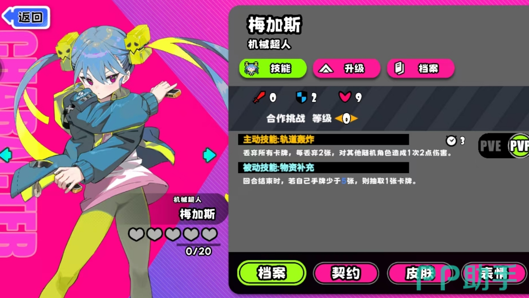 机械超人梅加斯是《吉星派对》中一位机制鲜明、上手门槛低的高人气角色。她的核心能力围绕“弃牌”展开——每次发动主动技能,将当前手牌全部弃置,并对敌方目标造成固定2点伤害。该效果不依赖距离判定,在标准模式与合作模式下均能稳定触发,但具体策略侧重存在明显差异。