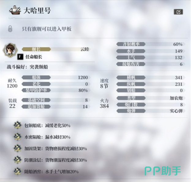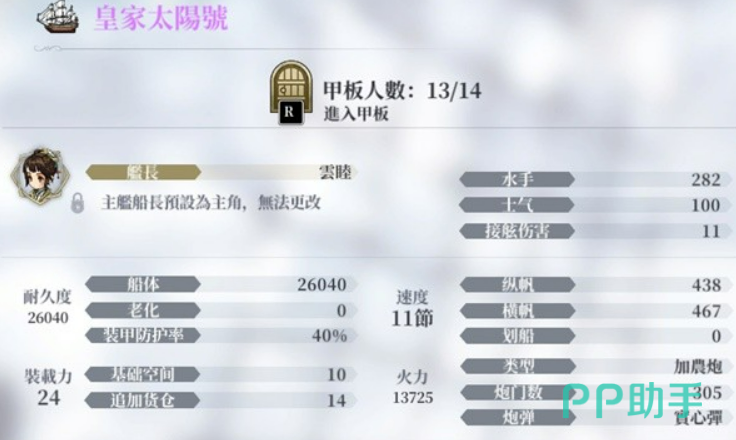 首推法国皇家战列舰「皇家太阳号」。该舰继承路易十四“太阳王”称号,是全游戏唯一耐久突破26000点(达26040)的海上堡垒。其基础航速为11节,在逆风航行测试中实测无速度衰减,且转向响应远超同吨位战舰。火力配置尤为突出:侧舷齐射总伤害达13725,单轮齐射即可摧毁五艘满配大福船。除硬性数值外,该舰还具备复合战术增益——白刃战攻防双加成、炮击威力提升、受击时自动触发减伤效果。这意味着无论拉锯对轰、贴身接舷还是持久消耗,它均处于绝对优势地位。需注意的是,该舰仅在游戏后期开放获取,前期不可建造或招募。