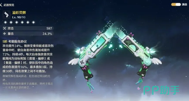 ——逆光跃彩套装:角色释放延奏后,下一位变奏入场角色攻击力提升15%;每点谐度破坏增幅效果额外提升0.3%攻击力,最高叠加至15%,持续15秒;换人时效果立即终止。