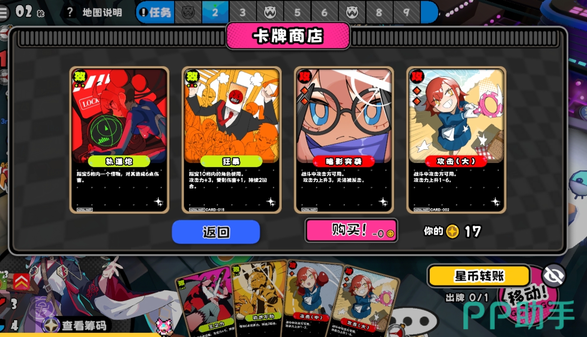 PVE下的战斗模式与PVP里的区别不大,都有主动攻击和被动接战的设定,人们可在路过怪物身边时主动向怪物进攻,利用技能的加成或手牌来叠加攻击力,并通过投掷骰子的方式来决定本次战斗自己所能打出的伤害,而被动接战则需要投掷骰子来判定防守力度和是否闪避成功。此外,PVP中的星币除了拿来升星外就只有买牌这一用处,所以各位不用像PVP那样存着等判定,当商店里刷出想要买的牌后可立刻买下,且多买些能造成真伤的手牌用来攻击怪物。