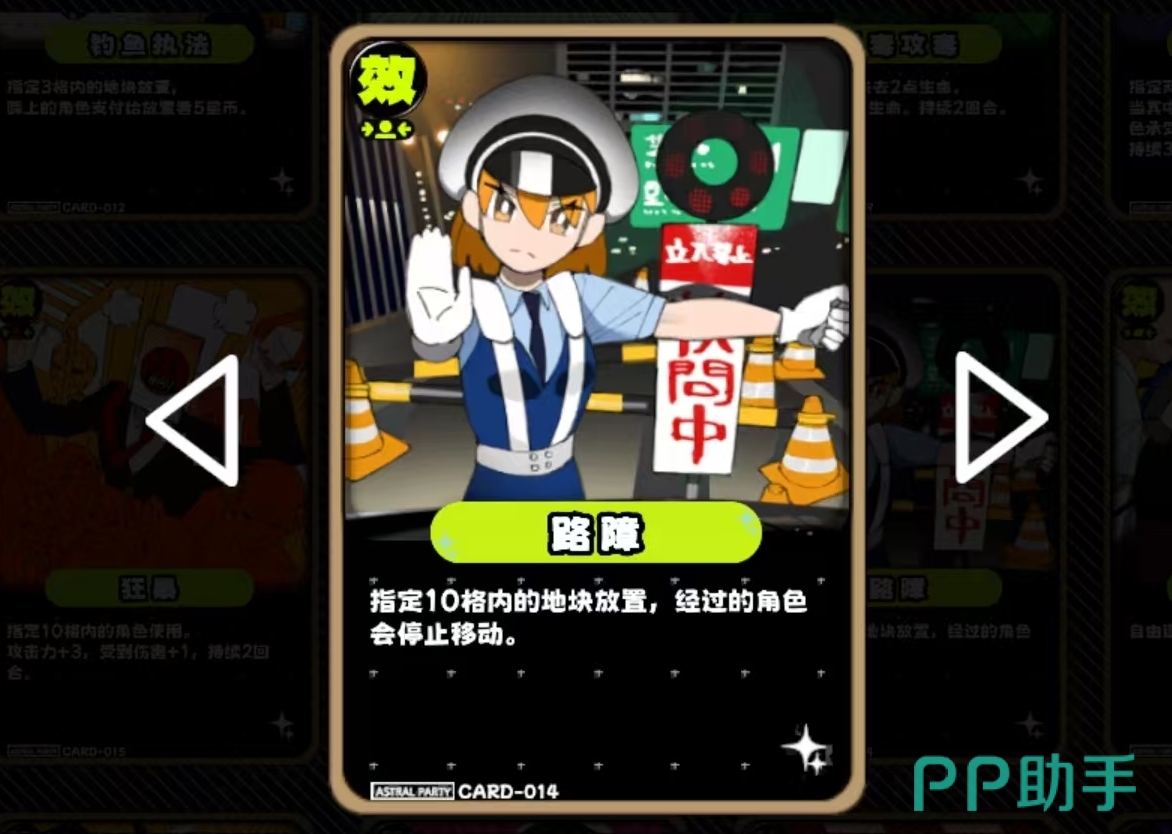 能阻碍其它角色前行的手牌,释放会在目标格子上存在一个路障,若有角色来到路障所在的格子会被强制停止移动,即便该角色还有可用的移动力也无法再往前走一步。该手牌通常用于进行关键拦截,例如在对手战力与自己相差太远时,放一个路障放置他跑掉,亦或阻止他前往初始点或中心点等。