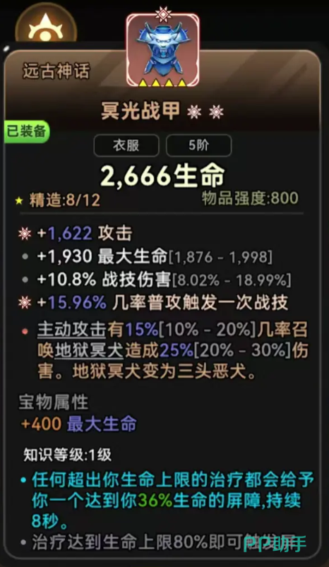 第二件重点推荐的是冥光战甲。该装备提供双维度强化:一方面显著提升角色基础属性,包括生命值、护甲强度及暴击率;另一方面赋予通用型增伤效果,触发条件不依赖特定伤害类型,实际加成幅度由当前装备所附带的词条数量决定。随着词条等级提升,其治疗转化效率与爆发潜力同步增长,因此特别适合需要短时间打出高伤害的爆发型角色使用。