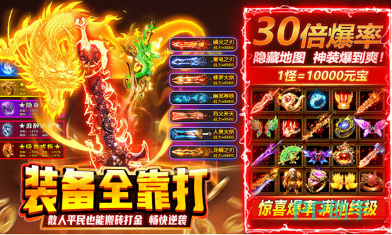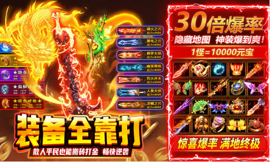 复古超变版本,看到这样的题材后,很多玩家都爱不释手,三种职业完全合并到一起,并不需要为选择职业而纠结,只要进入其中,就会被其无套路,无强制消费的爆装模式深深所吸引,延续原始经典打宝与pk特色,经典玩法升级的同时,有千人同屏沙城争霸,刀刀切割,爆率全开,获得畅爽感受。