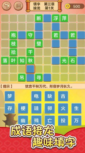 《成语接龙闯关》的玩法就是根据前一个成语的最后一个字来想出对应的成语来,接下去配置很简单,就是一块干净的屏幕,突出成语内容,让大家更加集中注意力,它会根据大家的水平调整难度,一开始都是常见的成语,玩的越好,出现的成语越有特性,还可以累积新的成语知识,玩的时候不知不觉可以学到很多东西。