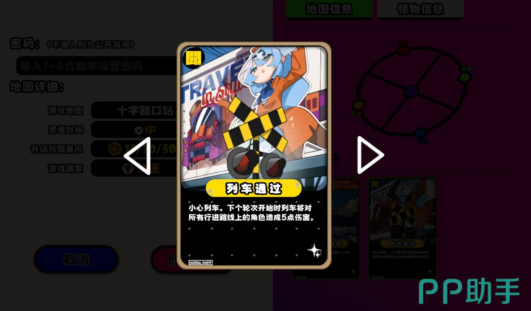 列车通行是贯穿整局游戏的关键事件:自第一回合起,每间隔三个回合便会触发一次列车通行预警。系统会以醒目的红色光效标示列车行进路线,所有玩家完成当回合行动后,列车立即沿标记路径驶过。处于该路径上的角色将承受固定5点伤害,且该伤害可直接将血量削减至零,不设下限保护。因此,及时响应事件提示、持续观察红光路径走向,并在列车到来前主动撤离危险区域,是生存与节奏维持的首要前提。此外,地图中同步存在小怪兽事件——生成后的小怪兽具备追击行为,会对范围内玩家发起攻击,进一步增加走位压力。