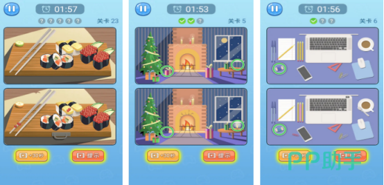 比较锻炼大家的观察能力以及注意力,和我们经常玩的找不同游戏特别相似,在每个关卡开始之后,上下都会有两张极度相似的图片,但是每张图片中也隐藏五处不同的地方,需要在规定的时间之内将五处不一样的地方全部找到,就比如筷子的颜色或者是食物的细小细节等等,只有仔细观察,才能完成关卡的任务,顺利闯关。