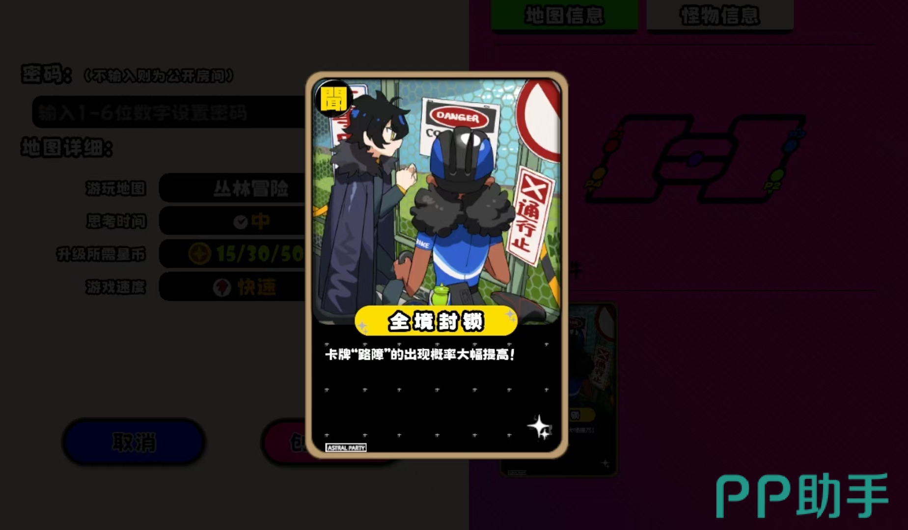 《吉星派对》丛林冒险地图以高频交互与策略性地形著称,其中“路障手牌”作为核心机制道具,赋予玩家主动干预移动路径的能力。该地图采用标准棋盘式布局,关键岔路口密度显著高于其他常规图谱,配合“路障手牌出现概率提升”的专属设定,使地形控制成为胜负关键环节。