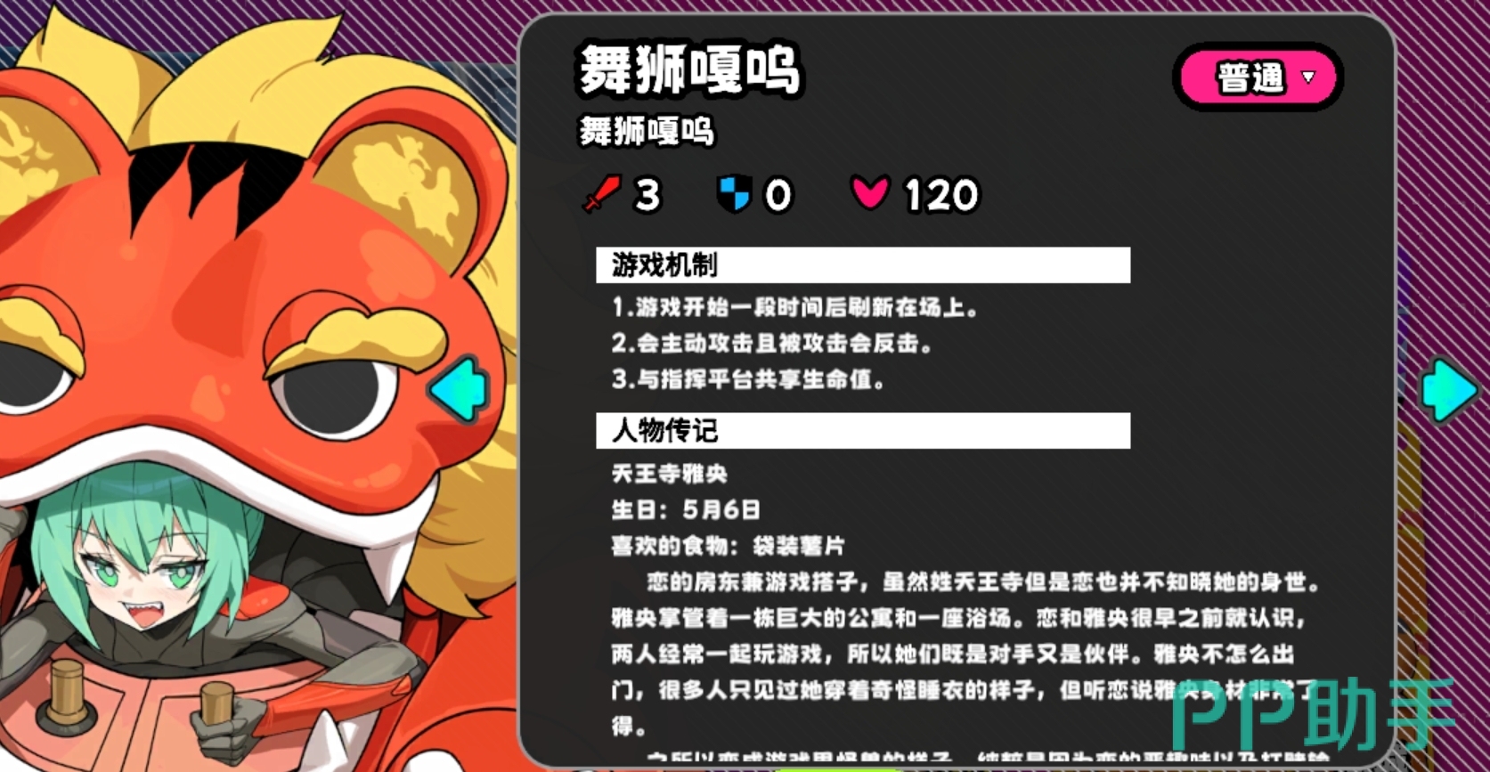本关设有双Boss结构:“舞狮嘎呜”与“指挥平台”,二者自第3回合起同步登场,且共享同一生命值池——击倒任意一方,另一方将立即退场。其中,舞狮嘎呜具备反击能力,每次成功命中玩家后,自身攻击力永久+2,无上限;指挥平台则完全免伤于普通攻击,仅受手牌与技能伤害影响,且每承受一次伤害,当回合后续所受全部伤害均额外+1(含后续触发的多段伤害)。