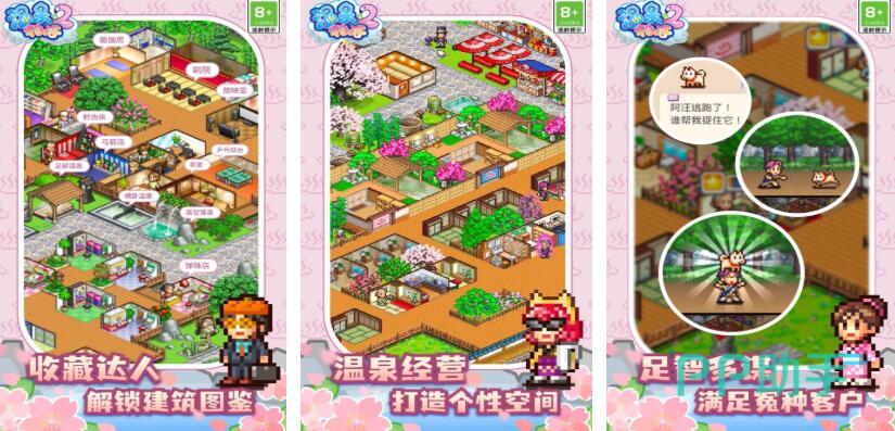 《温泉物语2》为所有玩家提供了多样化的设施,玩家可以在温泉酒店内搭配各种室内建筑物,比如餐厅、游戏厅和购物中心等。当然除了建造以外,搭配时还要考虑植物绿化环境和繁荣度。忙不过来的时候还可以招募员工,让员工来接待游客。延续了开罗系列游戏的经典像素画风,以简洁明快的线条勾勒出了日式温泉小镇的整体样貌,喜欢日式模拟经营游戏的玩家也可以尝试。