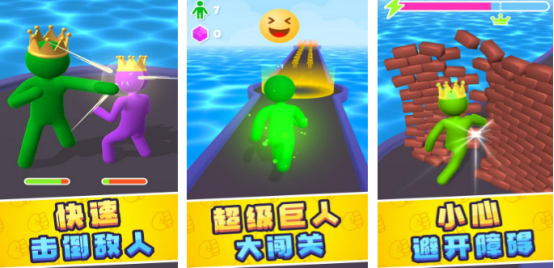 清新靓丽的游戏画风,还以跑酷元素为主,其中将会看到一个高大的巨人,通过左右滑动屏幕的方式就能让人物快速奔跑,还要将跑道上各种小人快速收集,这样就会让自己变得越来越大,还有超强的攻击实力。因为在每个关卡最终都会有疯狂的boss需与之搏斗,通过拳打脚踢的方式将对方踢上天。沿途除了小人物之外,还有很多钻石大家来收集,以此解锁更加绚丽的皮肤类型。