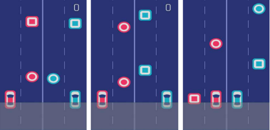 红色以及蓝色的小汽车,将会同时出现在一个手机屏幕中,可通过同屏操作的方式控制自己的小汽车快速向前。点击屏幕即可控制汽车运行的方向以及车速,只要在规定的时间之内超越对手,快速到达终点就算获胜。自己喜欢的颜色汽车前进的距离越远,获得的分数也会越高,逐渐挑战突破自己的高分。