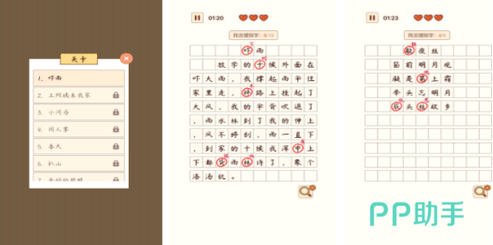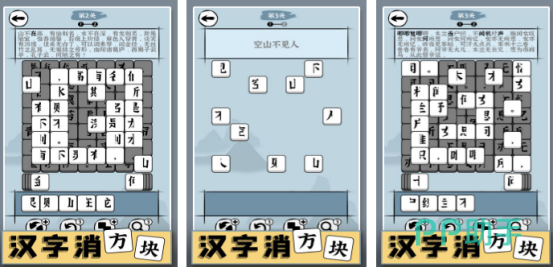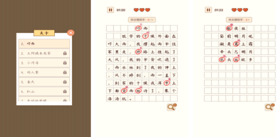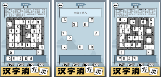 汉字以及经典的消除玩法为核心,在开局之后,每个关卡中屏幕上方都会呈现出不同的部首或者是偏旁等等。大家只要按照自己所学的知识将两个方块组合成一个完整的汉字即可消除,掌握更多的古诗词知识,就比如在关卡开始之后,将会看到空山不见人这样的提示,按照具体的提示,将所有的汉字全部找到即可掌握更多古诗词知识。