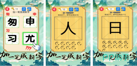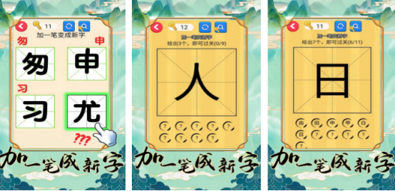在游戏中将能感受到我国文字的博大精深,开局后,屏幕最中央会看到田字格中有一个简单的字,而大家要按照加一笔变成新字的具体规则,完成挑战,所有的难度也应有尽有,比如刚开始挑战是,从最简单的汉字开始入手,比如一个人字通过添加一笔的方式就能变成多个不同的字眼。