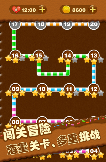 《糖果连线》画面很有甜蜜感,形状以及颜色的糖果排列的很整齐,游戏规则很简单,需要大家把三或者以上的糖果连成直线来进行消除,糖果之间都有不一样的特效,消除后会带动一整片区域一起消除,有些则会消除一整行,关卡也会设置收集目标,像是需要集齐多少特别糖果,完成目标的过程轻松又好玩。