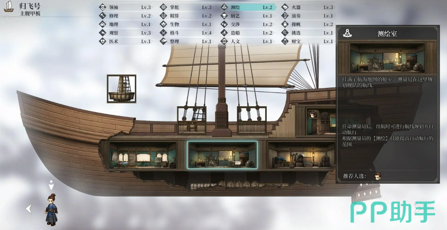 启航前需重点配置两类功能舱室:瞭望台须安排具备观测资质的船员驻守,可显著提升航行中遭遇沉船残骸与隐秘宝藏的概率;测绘室则需指派专业人员值守,以激活自动导航功能,大幅降低手动操舵频次与操作失误风险。另需密切关注船体老化数值——前期木质船体损耗较快,若未及时维护易触发结构失效事件。待解锁船匠职位后,该隐患将得到有效控制。