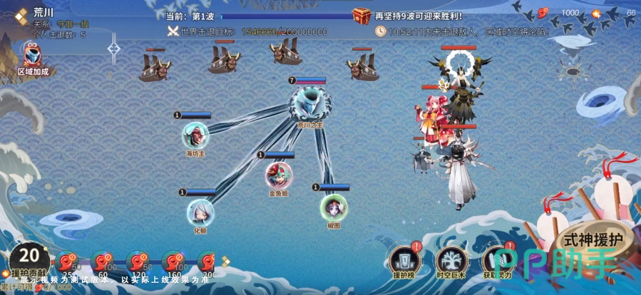 每个区域设有多波次敌人进攻,以“荒川”为例,共包含9波敌军。界面顶部明确标注“世界击退目标”,右侧同步显示倒计时限制。玩家需在限定时间内,配合全服力量共同达成总击退数量要求,方可视为该区域守护成功。