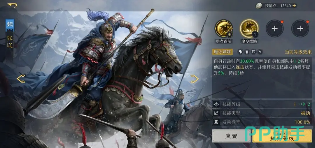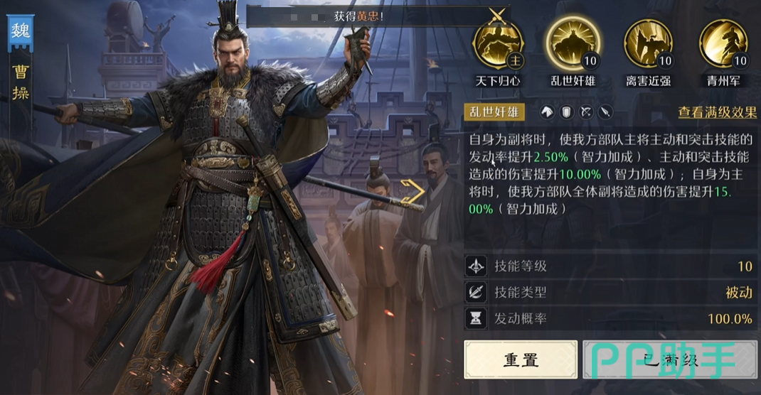 在游戏前期金色战法尚未齐备的情况下,可优先使用紫色品质战法【反震】作为过渡,有效激活曹操被动反伤机制,降低培养成本并维持战力平滑成长。