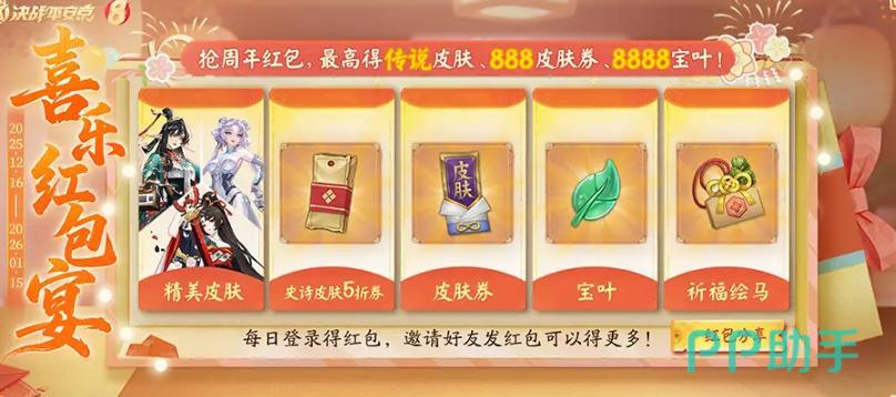 12月26日当日登录游戏,即可直接领取1000限时勾玉及20张吉愿达摩券。同期开启“喜乐红包宴”活动,玩家通过参与互动可抽取传说级皮肤、888皮肤券、8888宝叶等高价值道具,并额外提供式神碎片、改名卡及功能型礼包等实用资源。