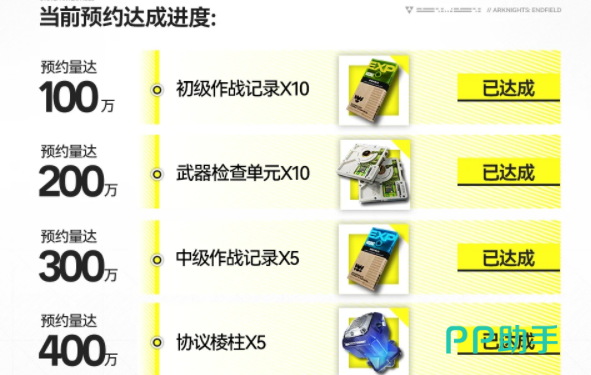 《明日方舟:终末地》全球公测定档2026年1月22日。目前游戏已开启全平台预约,参与预约即可解锁专属里程碑奖励。预约人数达100万,可领取10个初级作战记录;预约达200万,额外获得10个武器检查单元;预约达300万,将发放5个终极作战记录;当前预约总量已突破400万,公测开启后所有预约用户均可领取5个协议棱柱;若最终预约量达成500万,还将解锁限定头像框。此外,完成全部预约阶段目标的玩家,还可获得五星干员“昼雪”,助力初期战术部署与战力成型。