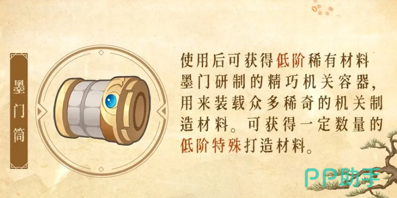 大家在这里能够了解到的路线跟大家选择的天工制作路线都是有关的,对于玩家来说,很多前期在选择了自己的路线之后,在其中会拿到一些比较相关的道具,比如说如果大家选择了天工开物图鉴来进行体验的话,在其中有机会拿到的是墨门筒这个道具的话,在其中是可以获得更多稀有道具材料的,而且在墨门里面,大家一般研究各种机关的时候都会用到这个墨门筒,这也是其中各个机关的制作材料之一,而且获取对应数量之后,大家就可以通过低阶的品质来打造一些材料,那么在日常活动里面大家也是可以快速拿到这些储物保护器的。