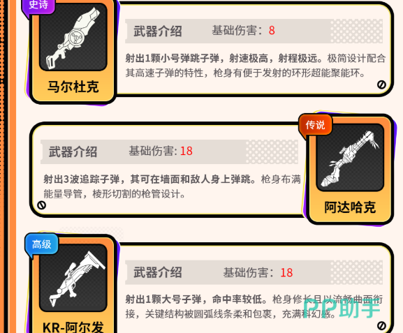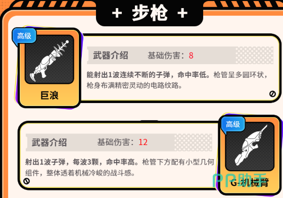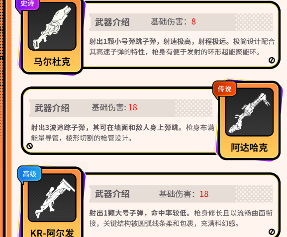 步枪家族的成员还是比较多的,每一把都会拥有独特的战斗风格。入门级可以选择巨浪,每一波能够射出三颗子弹,命中率比较高,基础性伤害是12点。新手如果选择这一把武器,就能轻松的应对战斗节奏,处理一开始的小怪。阿达哈克主要是走极致伤害路线18点基础伤害的大号子弹,虽然命中率低一些,但是威力十足,很适合喜欢爆发输出的玩家。如果喜欢灵活走位加上持续输出,那不如就选择高级步枪阿尔法。可以直接射出弹跳子弹,枪身会充满装甲的厚重感,力量感很出色。
