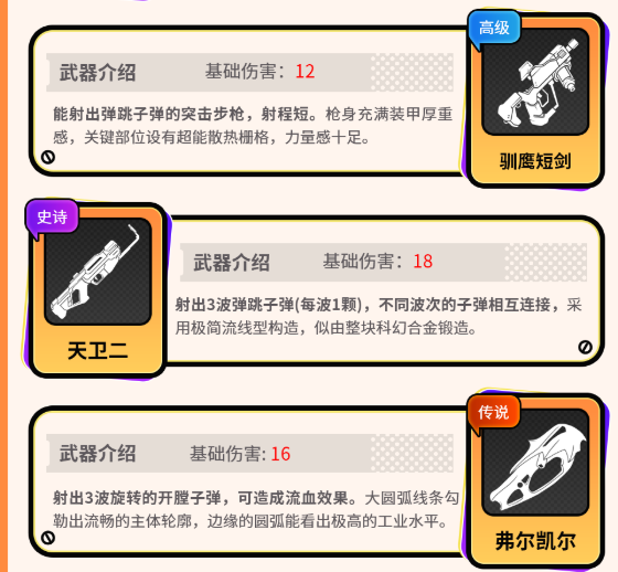 弗尔凯尔会拥有元素伤害,火焰子弹搭配低概率的电击效果,让普通的攻击也会有额外的控制,配合灼烧伤害,持续消耗敌人,闯关效率可以翻倍。史诗级别的步枪更值得选择,例如机械臂,射击的速度较快,射程较远。小号子弹就能穿透战场,极简的设计搭配超能聚能环,让远距离的压制变得比较轻松。驯鹰短剑的三波弹跳子弹可以相互连接,是由多个科幻合金锻造而成,而子弹的轨迹变幻莫测,可以覆盖更广的范围。