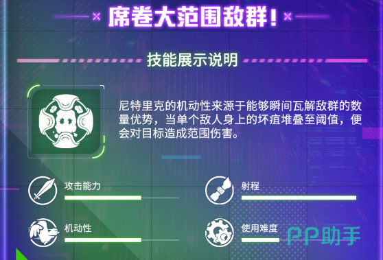 这种机制让尼特里克在应对大规模敌人时就会拥有无解的优势。想象一下,当你被数10个敌人包围时,他只需要集中火力攻击其中一个就能引发爆炸,瞬间就可以清理一大群。在爆炸之后,如果周围还有残留的敌人,还可以借助爆炸的余威,给新的目标附着坏疽,将形成连锁反应,让敌人在恐慌中面临溃灭。除了强大的范围清场能力之外,机动性也会暗藏玄机。灵活并非来自超高的移动速度,而是源于对战场节奏的精准把控。