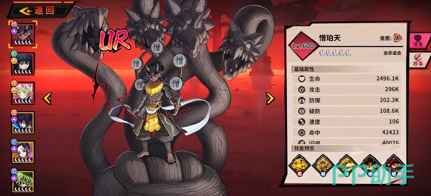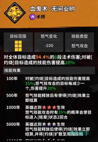 他在当前的效果当中有血鬼术的效果,可以对全体目标造成94.4%的8段连续性伤害,这类伤害效果如果是对被灼烧的目标释放的话,还可以造成技能伤害基础上面再提升20%的输出,当敌方有目标被憎珀天给击杀时,他还会立即释放一次50%伤害的怒气技能,这个怒气技能是属于一个超强大招,所以每个回合是只能触发1次的,但是只要是在这个技能使用期间,他在自身伤害数值上面都会提升3.5%的效果,所以放在当前的UR品质里面能够达成的强度绝对是其他角色难以比较的。