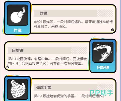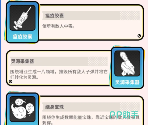 回旋镖就是操作党的最爱,在投掷之后飞行一段时间会自动的折返,接住之后还可以重新的投掷,一整套连招下来,敌方人根本就没有机会招架。弹跳手雷被称之为绕后神器,撞墙反弹的特性,让他可以绕过障碍物,对隐蔽的敌人造成出其不意的爆炸伤害。如果偏爱持续输出,那不如就选择瘟疫胶囊,可以让所有的敌人陷入到中毒的状态,持续掉血,真的是一点都不费力。简易刺激器是主要针对带有负面状态的敌人,可以轻松的打出双倍伤害。面对铺天盖地的子弹,灵元采集器,就等同于是保命的法宝。
