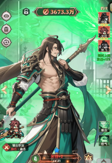 第一个介绍的关羽就属于一个强度效果非常经典的红将,在当前品质里面其实用法效果就算是普攻也有稳定的扣血功能,达到突破2级的时候还可以在使用大招的时候直接没有消耗数值哦,普攻叫做青龙偃月,可以对敌方血量最低的一位目标造成关羽攻击力上面120%物理伤害,之外再额外附带目标已损失生命10%伤害,附带伤害不超过关羽攻击300%,所以也是输出有一部分限制的,而另外在飞龙在天这个怒气技能当中,关羽可以对敌方血量最低的目标造成410%物理伤害,在此时还有一个效果是可以触发的,不过需要目标血量低于50%,此时关羽用大招就会用到暴击的词条效果了。