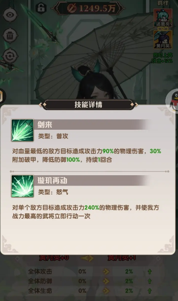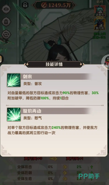 接下来的黄月英来作为普攻的时候可以对血量最低的敌方目标造成攻击力90%的物理伤害,30%附加破甲,降低的防御数值上面100%的百分比,而璇玑再动则是她的怒气技能,用起来对单个敌方目标造成攻击力240%的物理伤害,并使我方战力最高的武将立即行动一次,所以在增加整体的行动能力之后,黄月英可以给我方阵营带来的加成确实很多。