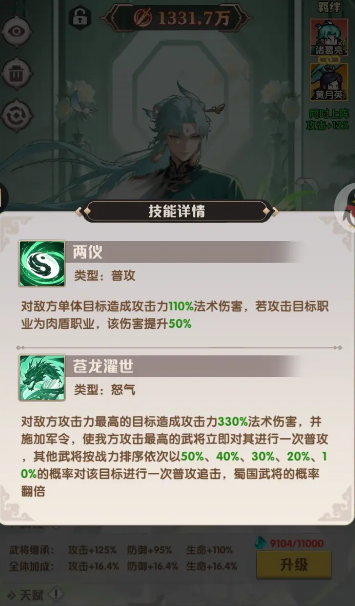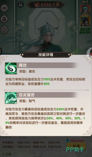 诸葛亮经常跟黄月英一起上场的话,在其中两仪的普攻带来的是对敌方单体目标造成攻击力110%法术伤害,如果此时攻击目标职业为肉盾职业,则这一次带来的伤害提升50%,而苍龙濯世作为怒气技能,对敌方攻击力最高的目标造成攻击力330%法术伤害,并施加军令,使我方攻击最高的武将立即对其进行一次普攻,其他武将按战力排序依次以50%、40%、30%、20%、10%的概率对该目标进行一次普攻追击,所以用他来搭配其他武将,特别是蜀国武将的时候在自身使用的这类多次攻击频率当中会有概率翻倍的效果。