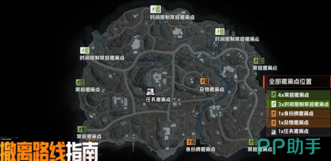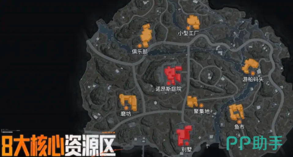 地图共划分8处核心资源聚集区域:其中别墅与诺昂斯庭院为高级资源点,物资密度与稀有度显著更高;磨坊、聚集地、鱼市、游船码头、俱乐部及小型工厂则构成六大中级资源区,覆盖多样化搜刮需求。撤离机制同步更新——包含常规撤离点(每局随机启用1个)、限时撤离点(仅开放前10分钟,每局随机启用1个)以及身份牌撤离等多种方式,具体位置分布可参考下方示意图。