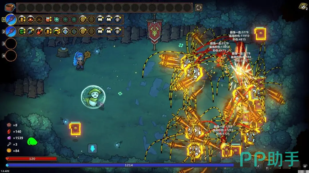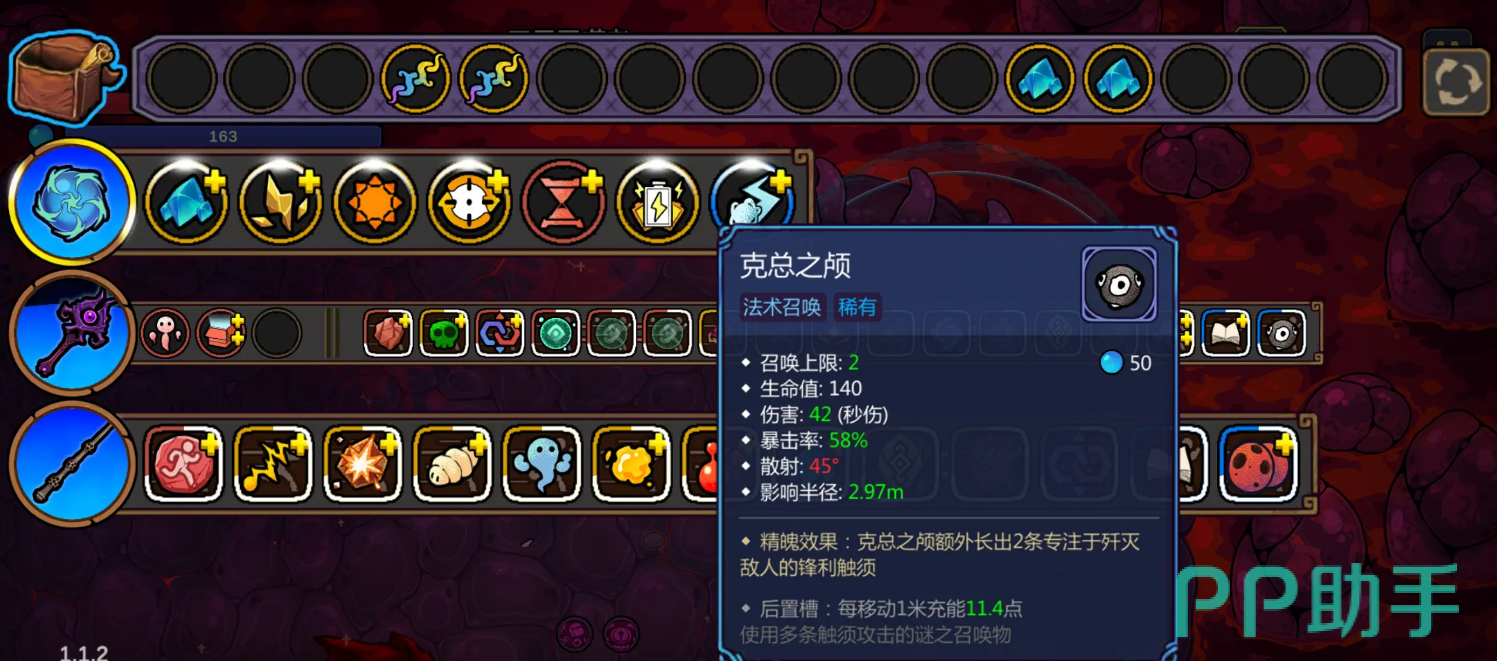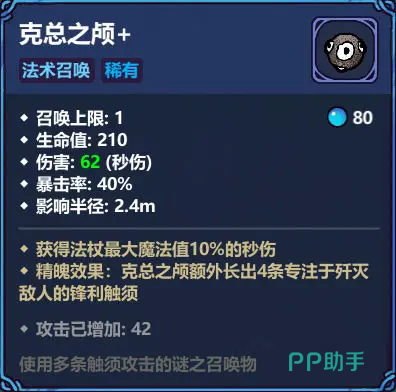 在构建思路方面,优先提升召唤上限是关键突破口。当前最高效的途径为使用魔导书进行召唤:单层魔导书即可稳定召唤三具“克总之颅”;建议至少配置两层魔导书,组成镶嵌式套装,即可达成前期理想的单位密度与战场控制力。当召唤数量与刷新频率达到阈值后,应转向伤害强化路径——通过适配法杖,可获得相当于自身最大魔法值10%的每秒魔法伤害加成,直接转化为触须的实际输出效能。