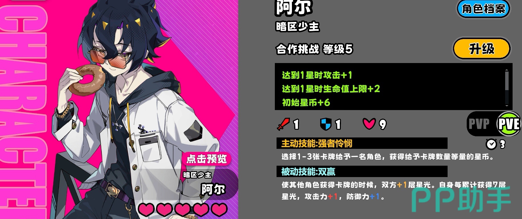 阿尔拥有两个被动技能:【钞能力】与【双赢】。前者在每次获得星币时触发,立即提升1点防御力与2点攻击力,持续2回合;后者则在向其他角色赠予卡牌时生效,使双方各获得1层星光。当自身累计星光层数达7层时,永久提升1点攻击力与1点防御力,该效果可多次叠加,构成其成长曲线的核心支点。
