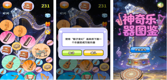 上百种精美的乐器类型应有尽有,从最基础的沙锤,再到最高档的钢琴等等。经典的关卡内容都有具体的分数要求或者是时间限制,从屏幕的正中央会随机掉落下不同的乐器类型,在此基础上又增加合成的元素,合理滑动屏幕,将两个相同的乐器发生碰撞,即可快速合成更高等级的乐器类型,其中还有骰子变幻的独特道具,能帮助大家突破高分,让其中任意的乐器变成为万能乐器。