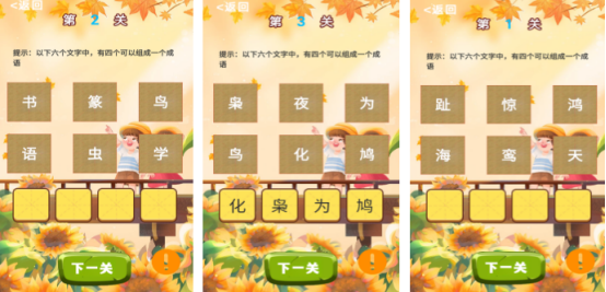 覆盖大量的成语知识,在关卡开始之后,屏幕最上方会呈现出6个单个的汉字,而下方又会有4个空白格。主要的任务就是用自己所学的知识,从这些单个的汉字当中寻找到完整的成语,只要这4个字可以组成完整的成语,并且汉字的顺序正确即可完成闯关,精美的关卡内容应有尽有,在挑战时还可学到更多知识。